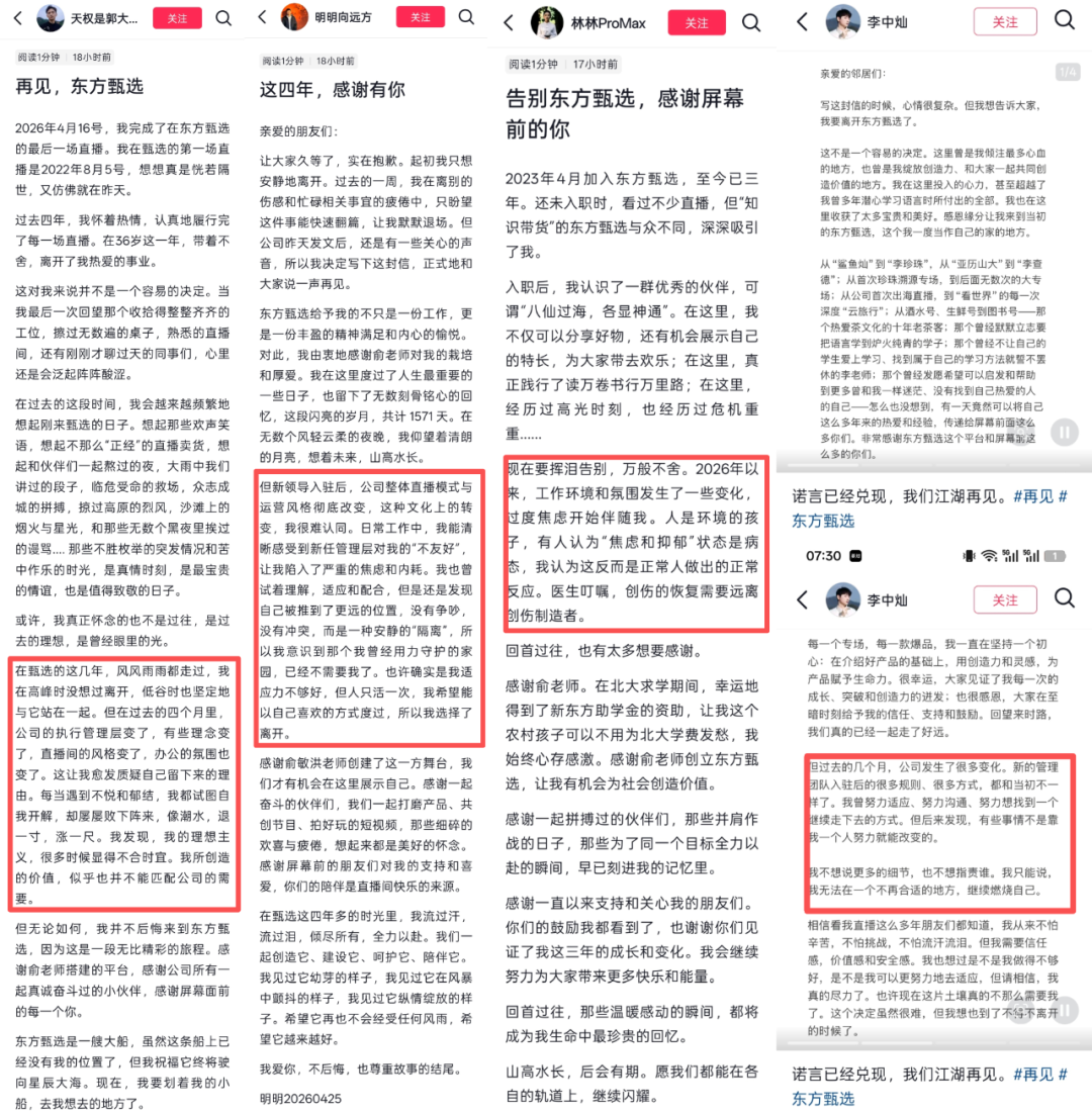 4月25日,主播中灿、林林先后发布告别内容,正式确认离开东方甄选,至此四位主播全部完成官宣离职。